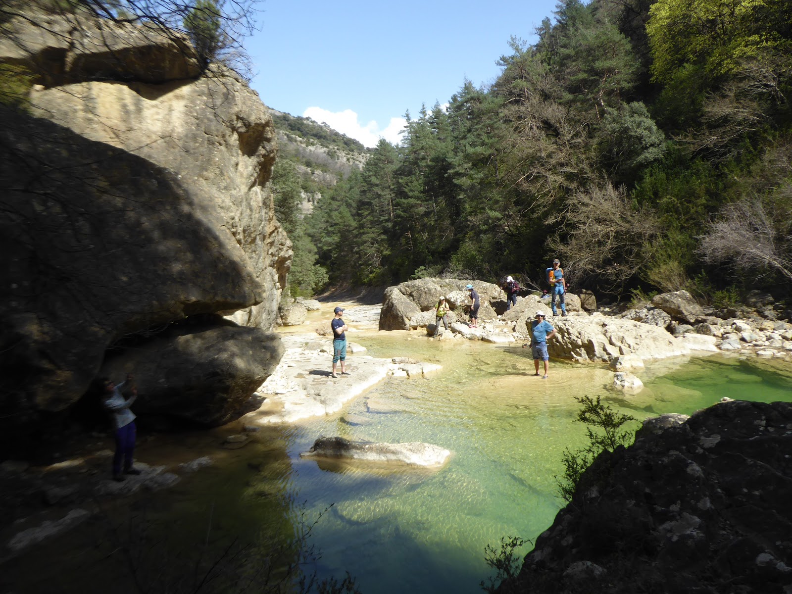 Primer tramo de monte descarnado, hasta entrar en el acogedor bosque por un sendero que nos baja hasta dar con el de vuelta, pero antes tenemos que visitar el Confesionario, que para eso hemos venido. Se cruza un barranco y se sigue por el sendero hasta dar con el río Sieste y cruzarlo por encima de un pequeño circo que alberga algún abrigo pastoril en desuso. Se deja a la izquierda el desvío para Campodarbe y se baja, entre cajicos* al fondo del río, que se cruza, a la par que recibe las aguas de ese barranco Fondo, encima de la poza de Chinchirigoy. Remontamos un poco para alcanzar, finalmente, el objetivo, conocido coloquialmente como “El coño del mundo”, y que no deja espacio a la imaginación.