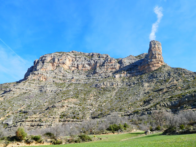Encontramos el desvío para Sopeira (PR-HU 247), que obviamos, porque continuamos por nuestro GR 18, que nos sube a un precioso prado, bajo una línea de alta tensión y coqueteando de nuevo con los límites municipales. La pista se vuelve pedregoso camino, que ya sin piedad va ascendiendo bajo los enormes paredones de este gran macizo, haciéndose más tortuoso y pendiente al final, hasta llegar a un collado, que da vista a la cuenca del Isábena. Continuamos y dejamos a la izquierda el desvío que tomaremos para el regreso. Seguidamente, otro collado, una fajeta y una zona de pastos, seguida de otra, incómoda ella, de piedra suelta, para alcanzar, parece que definitivamente, el lomo de la sierra, que vamos transitando por continuos subibajas sin perder las señales rojiblancas. La cabeza de alfiler de la torre de vigilancia ya es el alfiler entero.