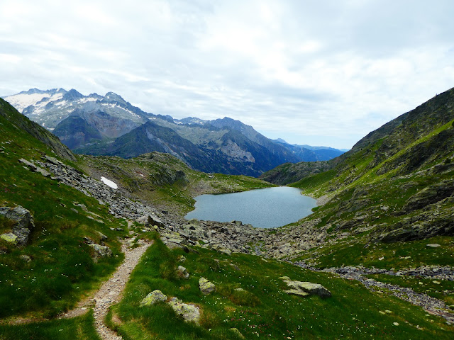 Y casi otro tanto hasta que nuestra mirada se pone en contacto con esa gran lámina de agua del ibón de Gorgutes, tras pasar un pequeño alto. Entre los mencionados Mall Pintrat, Estauás y Sacroux, al que nos dirigimos, lo encontramos en un lugar privilegiado, calmo, solitario, de rabioso color azul mirando al infinito, disfrutando del entorno, algo de lo que queremos contagiarnos. Lo dejamos a la izquierda sin molestar, y nos desviamos unos metros para asomarnos al puerto de La Glera, otro de esos pasos con más historia que presente.